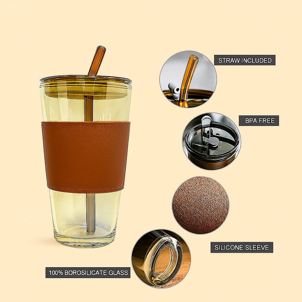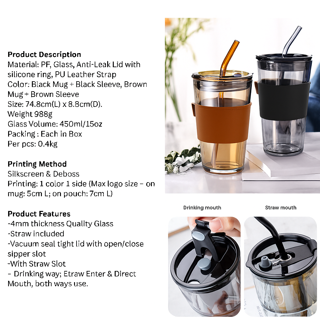 Material: PP, Glass, Anti-Leak Lid with silicone ring, PU Leather Strap