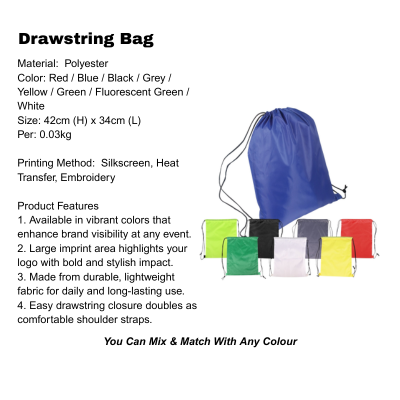 Drawstring Bag: Red / Blue / Black / Grey / Yellow / Green / Fluorescent Green / White