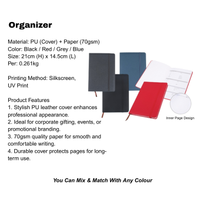 Organizer: PU (Cover) + Paper (70gsm)
