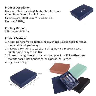 1. A comprehensive kit containing seven specialized tools for hand, foot, and facial grooming.