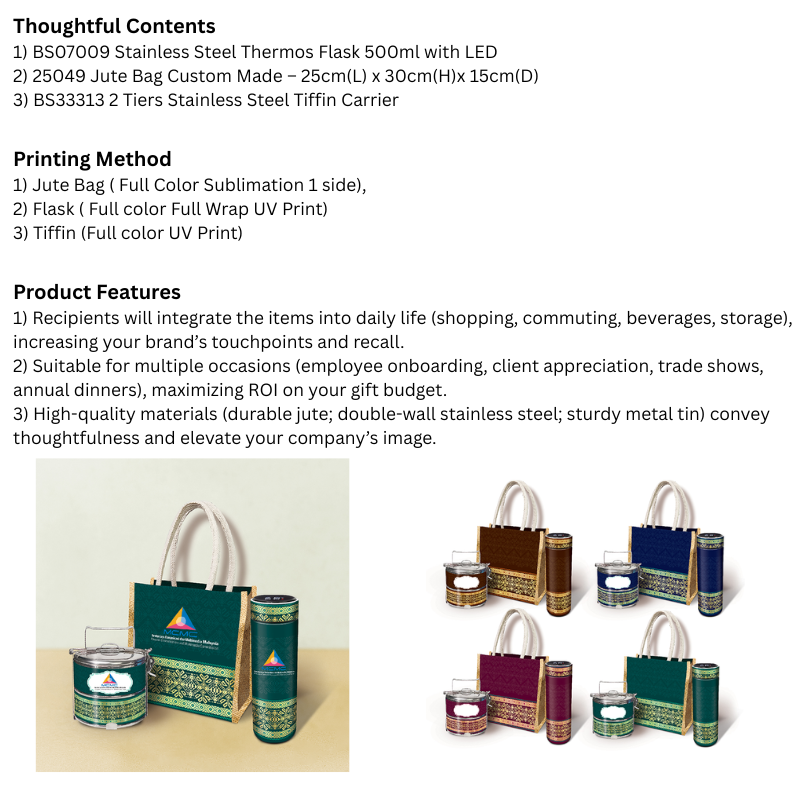 3) High-quality materials (durable jute; double-wall stainless steel; sturdy metal tin) convey thoughtfulness and elevate your company’s image.